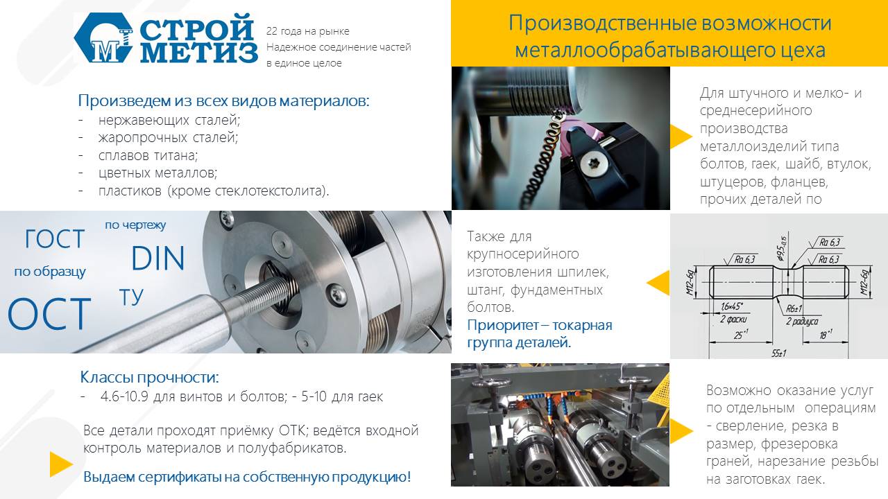 Оборудование цеха предназначено для штучного и мелко- и среднесерийного производства металлоизделий типа болтов, гаек, шайб, втулок, штуцеров, фланцев, прочих деталей по чертежам.