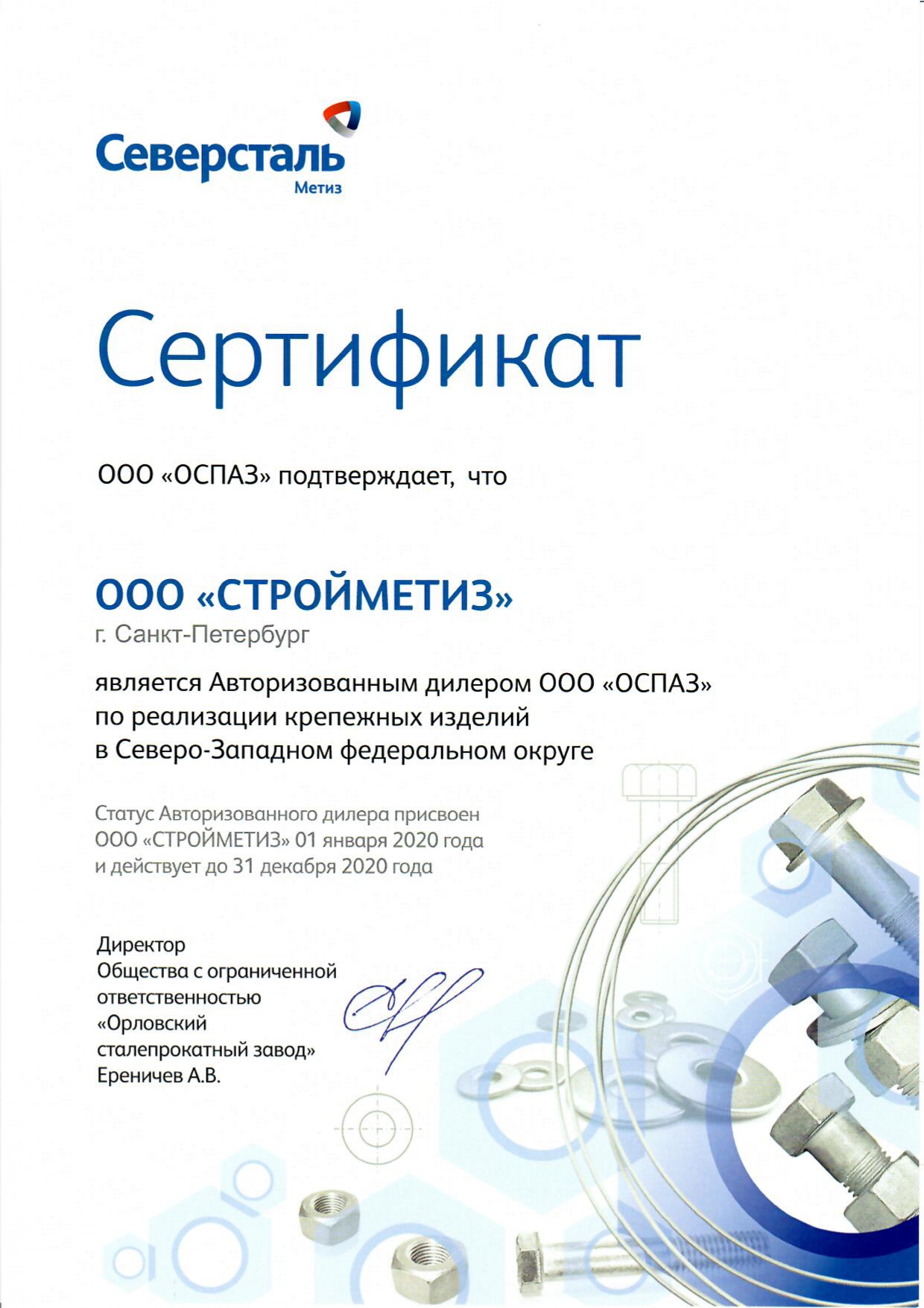 ООО «ОСПАЗ» выдал очередной сертификат на реализацию «Стройметизом» крепежных изделий в СЗФО в 2020 году в статусе Авторизованного дилера