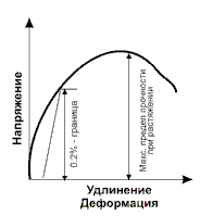 Условным пределом текучести называется напряжение, при котором остаточная (пластическая) деформация составляет 0,2%. Это значение используется для высокопрочных болтов (например, кл. пр. 8.8), которые при напряжении демонстрируют непрерывный сдвиг между упругой и пластической деформацией. Предел прочности при растяжении бывает трудно определить, поскольку нет четкой границы пластичности. В этом случае можно использовать так называемую 0,2% границу, когда постоянное удлинение составляет 0,2%.